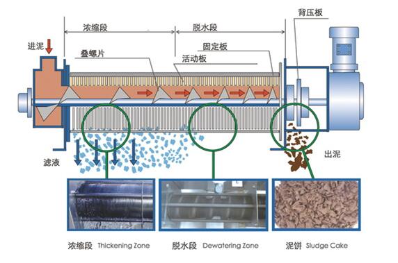 1、濃縮:螺旋推動軸轉動時,設在推動軸外圍的多重固活疊片相對移動,在重力作用下水從相對移動的疊片間隙中濾出,實現快速濃縮。