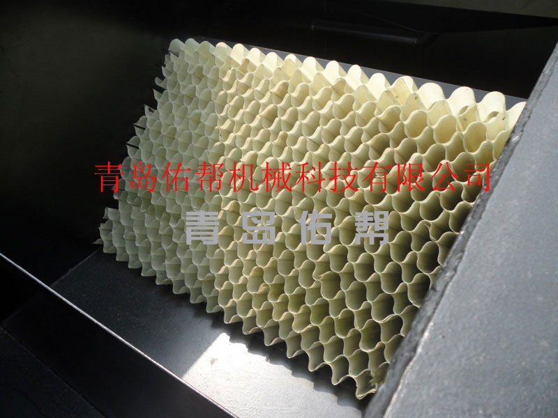 根據淺池理論發展而來的斜板隔油池,是一種異向流分離裝置,其水流方向與油珠運動方向相反,廢水沿斜板向下流動,經過斜板和沉淀區域后,通過溢流堰排出池體。廢水中密度特別小的油珠在斜板粘附聚集后,沿斜板下表面向上流動,含油浮渣會自流進集油槽,或經過刮渣機推送到集油槽內,經管道排出。密度相對比較大的懸浮顆粒等會沉降到斜板上表面,污泥聚集到一定程度,會沿斜板滑落到池體底部的集泥槽內。斜板材質一般為玻璃鋼材料,表面光滑、均勻。安裝方法大多采用波紋板峰對峰的方式,中間形成的空隙即為污水流經的通道。
